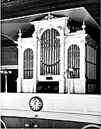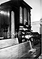 This organ, dedicated in October 1866, is the third for this building. The organ, which is intact and original, was carefully restored by the Andover Organ Co. in 1974, under the supervision of Robert Newton. It is still conetuned, and is tuned a bit sharp. An unusual feature are the two "thunder pedals" at the left of the Pedal board. They operate two extra pipes (A# and B below low C) of the Double Open Diapason 16'. |